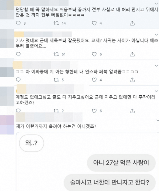 본 사건에 관련해 관련 기사가 나오자 작성자는 "제목부터 잘못됐다. 교제? 사귀는 사이 아닙니다. 애초에 틀렸어요"라며,