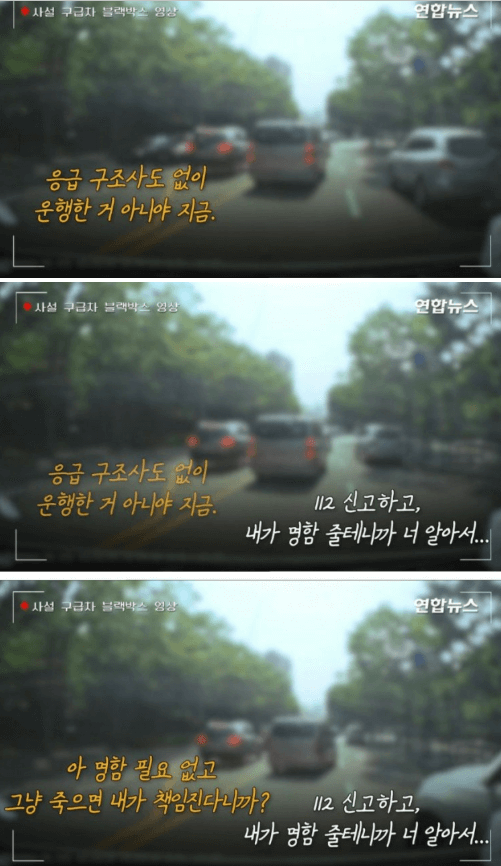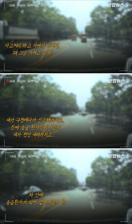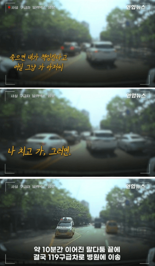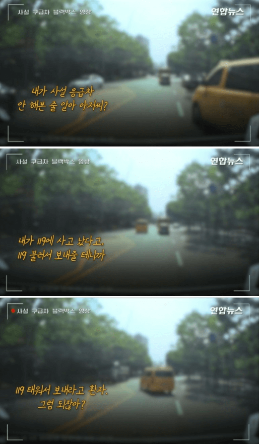 구급차 운전자가 "응급환자가 있으니 우선 병원에 모셔다드리자"고 했지만 택시기사는 반말로 "사건 처리가 먼저다. 환자가 사망하면 내가 책임지겠다"라며 막무가내였다고 합니다.