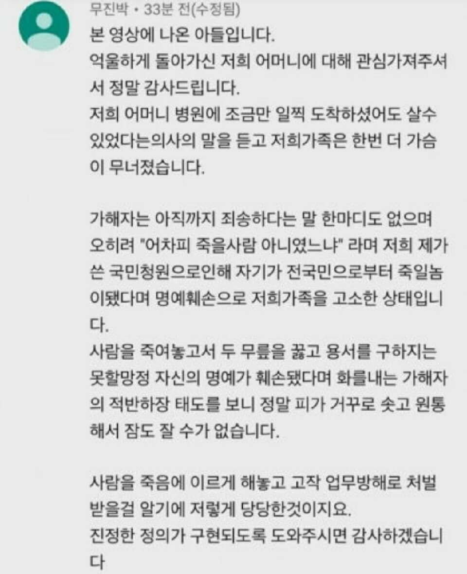 아래 사진은 피해자의 아들이 올린 근황 메세지입니다.