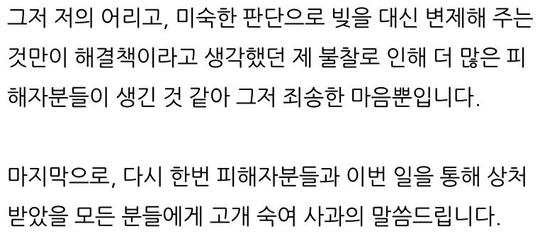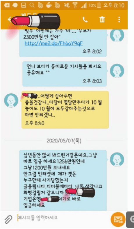 그 사람은 위기모면하려고 딸이 성공하면 준다 했겠지만 저는 그 당시 그런 말이라도 믿고 싶은 심정이었다. 그리고는 달달이 돈 갚는다는 사람이 3년 동안 10만원 보낸 게 말이 되냐”라고 주장했습니다.
