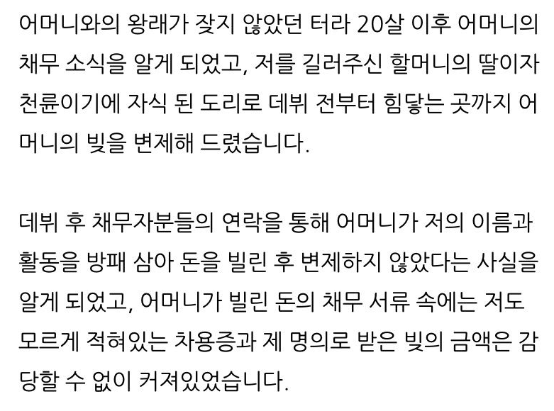 글쓴이는 “A씨는 딸이 잘 나가면 한 방이니 주겠다는 등 그때도 서울로 딸 엔터테인먼트에 찾아가고 그랬다. 저 정말 그 돈 받고 꿈이 있었는데 다 망가졌다. 이젠 그냥 돈이고 뭐고 그사람 벌 줬으면 좋겠다”라고 호소했습니다.