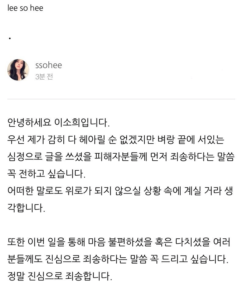 긴 무명생활을 거쳐 6년여만에 JTBC‘부부의 세계’를 통해 스타덤에 오른 터라 한소희를 둘러싼 논란에 팬들은 “조속히 해결되었으면 좋겠다”며 안타까움을 토로하고 있습니다.
