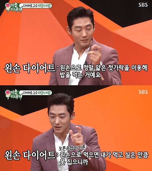 이태성은 "(왼손 다이어트는) 왼손으로 굉장히 얇은 젓가락을 써서 밥을 먹는 것이다. 내가 오른손잡이라서 왼손으로 먹으면, 원하는 만큼 음식을 집지 못한다"고 했습니다.