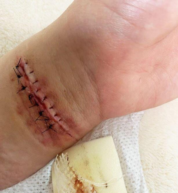 사진을 보면 심각한 창상과 함께 피부 봉합용 실이 꿰메어져 있으며 상처의 2차 감염을 막기 위한 거즈까지 찍혀 있습니다.