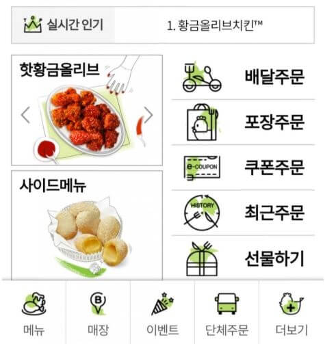 메뉴를 황금올리브치킨을 선택하시면 됩니다. 추가로 다른거 주문도 가능하시니 드시고 싶은거는 추가!