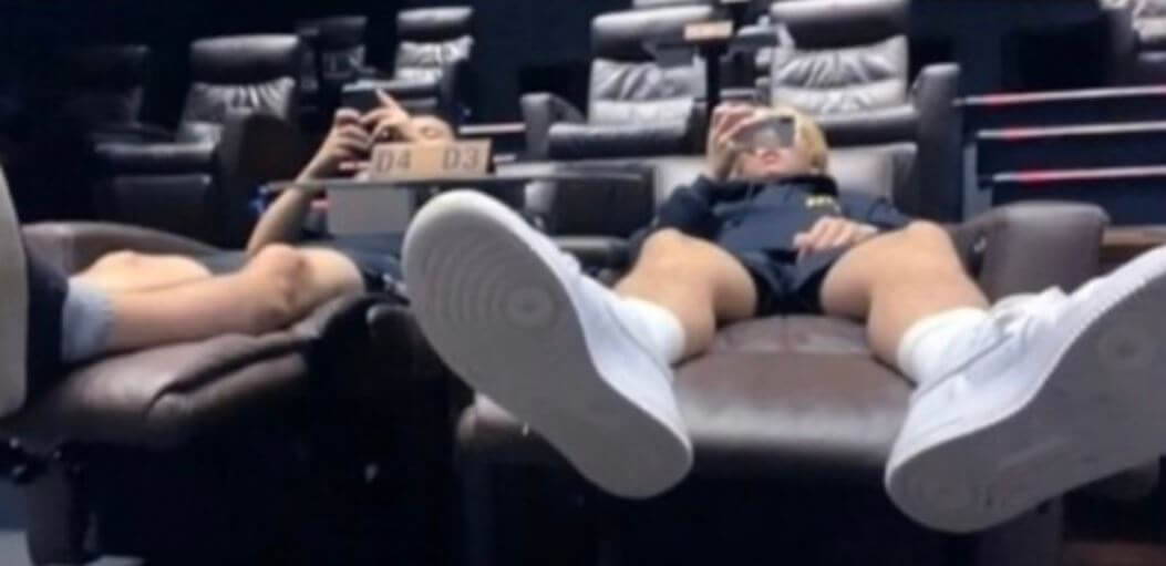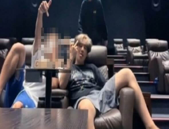 류정란을 포함한 4명의 성인 남성은 아이맥스관 등 각종 상영관을 누비고 좌석에 다리를 올리며 브이 포즈를 하고 있습니다.