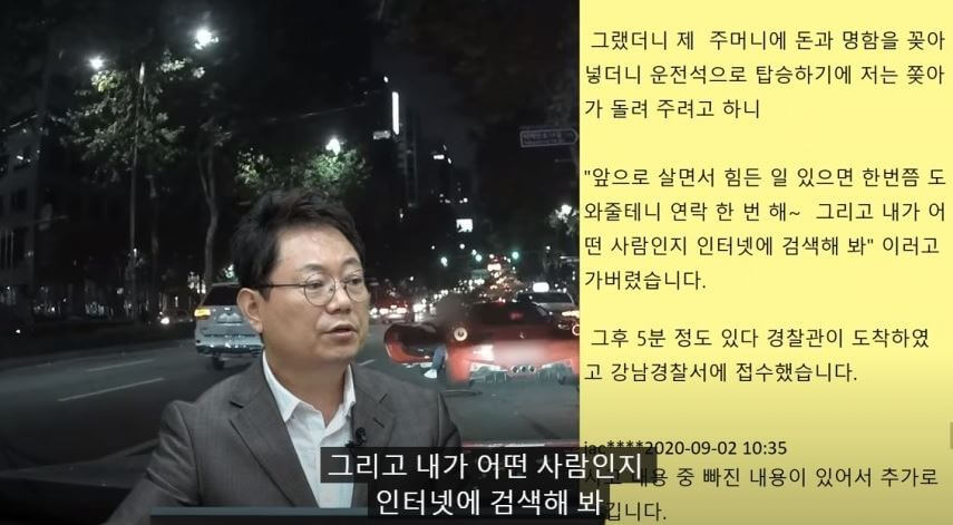 B씨는 돈을 거부하는 A씨의 주머니에 명함과 현금 316,000원을 꽂아넣더니 "살면서 힘든 일 있으면 한번 도와 줄테니 연락해라. 내가 어떤 사람인지 인터넷에 검색해 봐"라고 말하며 자리를 떴다고.