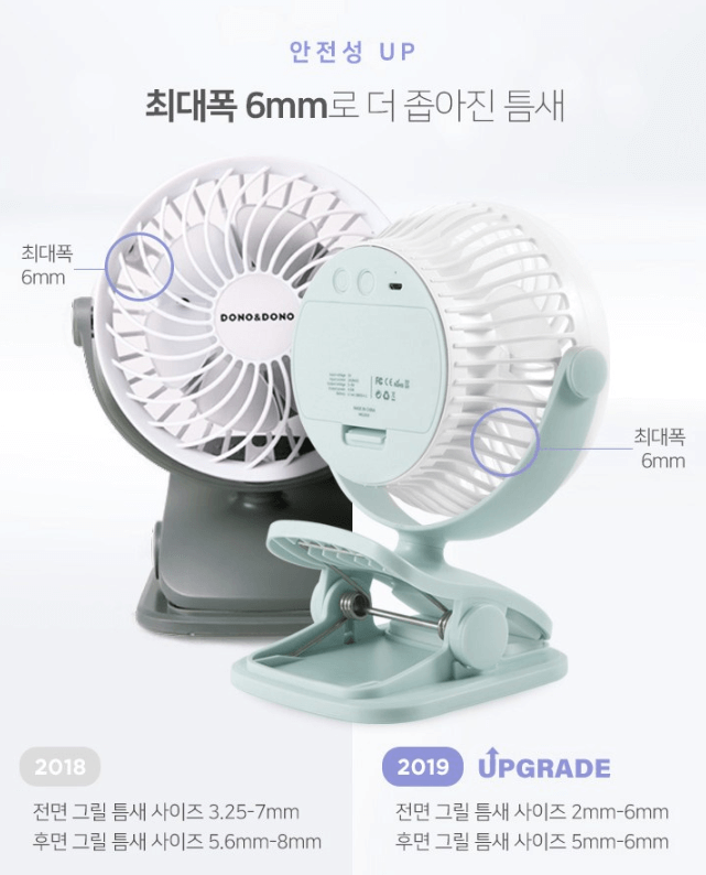 선풍기 커버의 최대폭이 6mm 밖에 되지 않아 손가락이 들어가서 일어나는 사고를 미연에 방지할 수 있습니다.