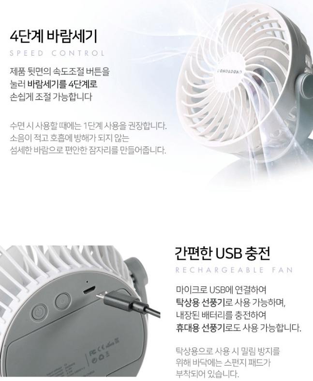 #3. 4단계 바람조절이 가능해서 다양한 상황에서 사용이 가능.#4. USB 충전방식으로 어떤 방식으로던 사용이 가능. (탁상용 OK, 휴대용 OK!!)