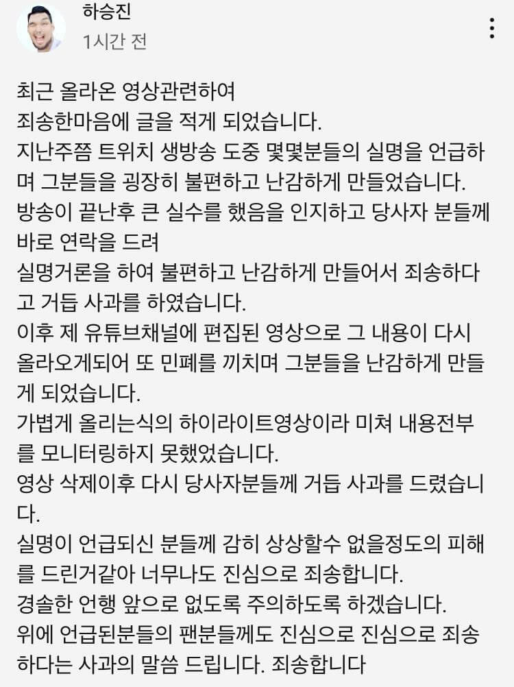 그는 "트위치 생방송 도중 몇몇 분들 실명을 언급하며 그분들을 굉장히 불편하고 난감하게 만들었다"며 "방송이 끝난 후 큰 실수를 했음을 인지하고