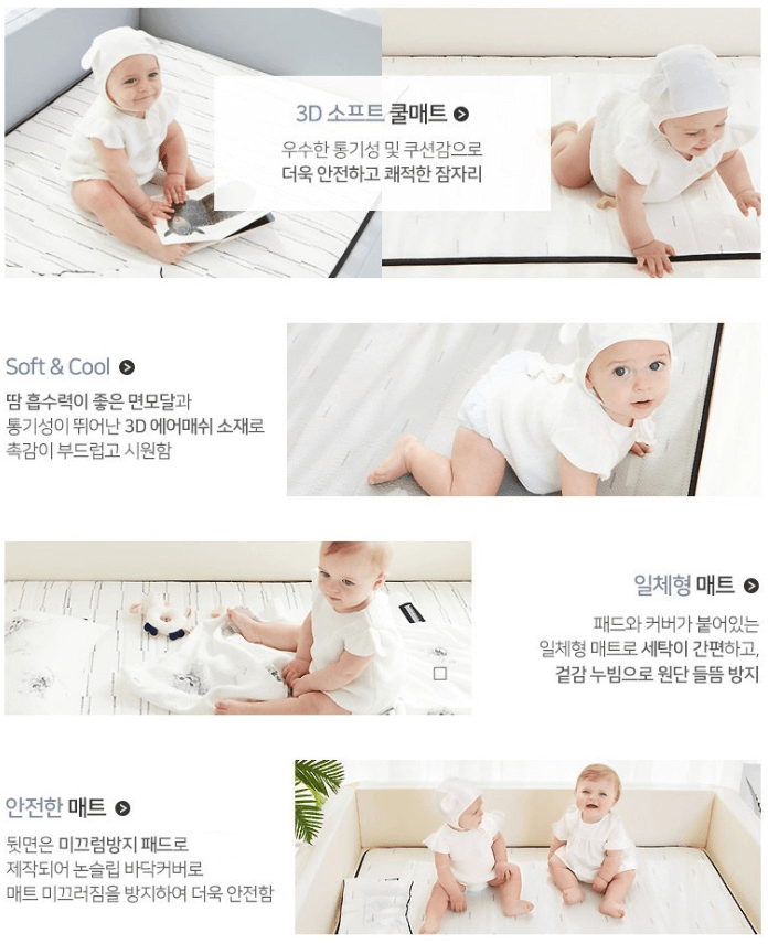 #1. 3D 에어매쉬 구조로 통기성이 우수하여 더욱더 시원하며 쿠션감도 좋아 아기가 활동하기 아주 편리합니다.#2. 면모달과 3D 에어 매쉬 적용으로 땀 흡수력이 좋아 부드럽고 시원한 촉감을 느낄 수 있습니다.#3. 패드와 커버가 붙어 있는 일체형 매트 구조라서 세탁이 편하고 겉감 누빔 처리로 원단의 들뜸을 방지했습니다.#4. 미끄럼 방지 패드가 있어서 아기들이 미끄러지며 다치는 사고를 미연에 예방할 수 있습니다.