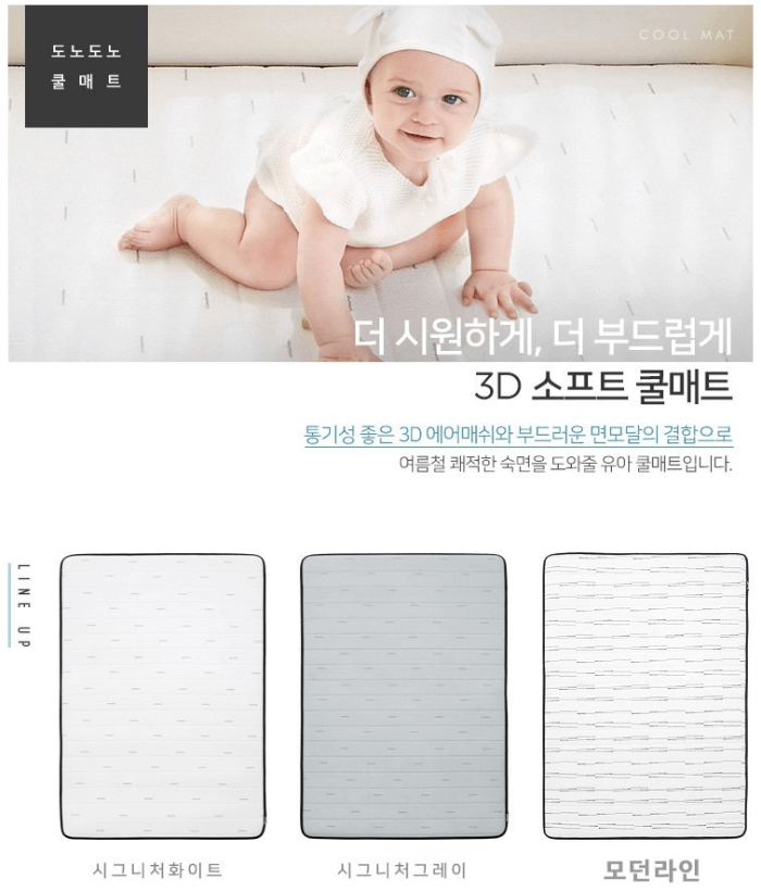 도노도노 쿨매트는 통기성이 좋은 3D 에어매쉬와 부드러운 면모달의 결합으로 여름철 우리 아기의 쾌적한 숙면을 도와줄 제품입니다.