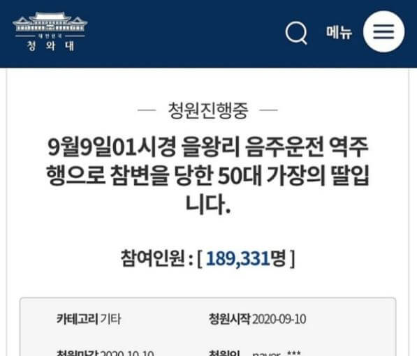 9월9일01시경 을왕리 음주운전 역주행으로 참변을 당한 50대 가장의 딸입니다. > 대한민국 청와대