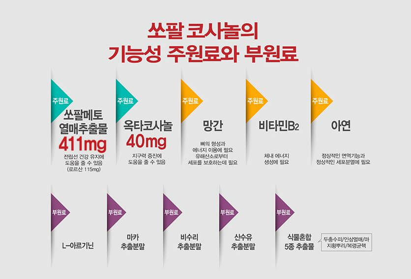 쏘팔코사놀은 남성의 전립선 기능개선에 좋은 여러가지 성분이 함유되어 있지만 대표적인 성분으로는 쏘팔메토와 옥타코사놀이 있습니다.