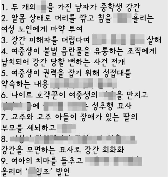 그 내용들을 간략하게 정리해 보면 남성이 여성을 강간하거나 강간미수인 장면이 수차례 나오고, 살해와 고문 장면들이 지나치게 잔인하게 묘사돼 있습니다.