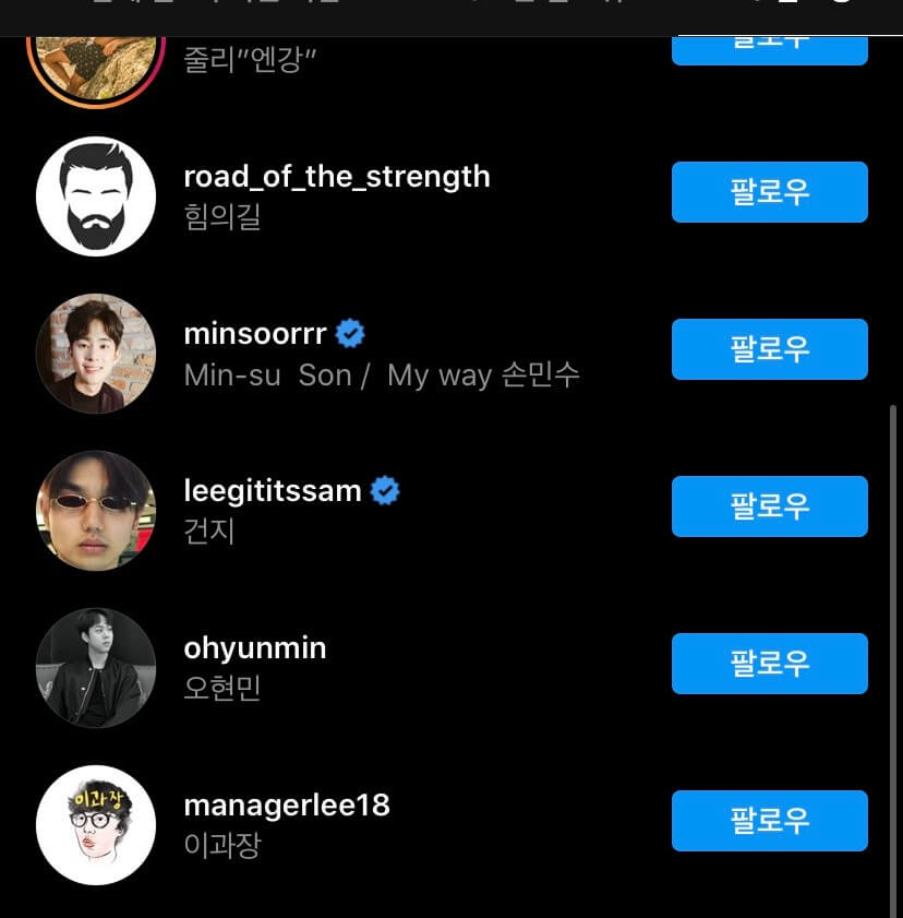 현재 합격자로 알려진 머독님의 인스타팔로우 목록을 보고 합격자를 예상했습니다.
