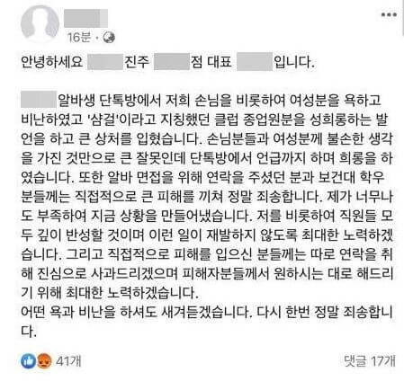 해당 사진이 각종 커뮤니티에 퍼지며 논란이 가속화되자, 해당 술집 사장은 페이스북에 사과문을 게시했습니다.