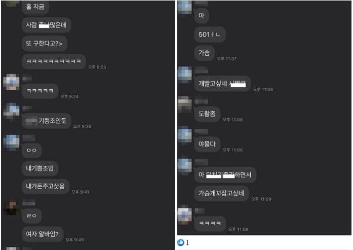 이어 이들은 여성 아르바이트생을 '기쁨조'라고 지칭하며 "내가 돈 주고 샀다"라고 발언했습니다.