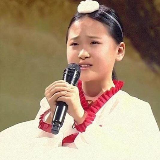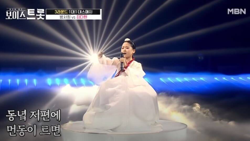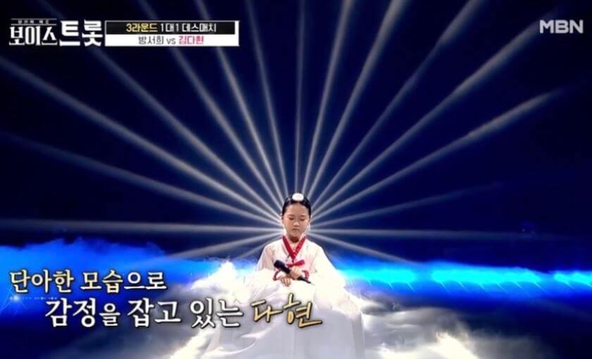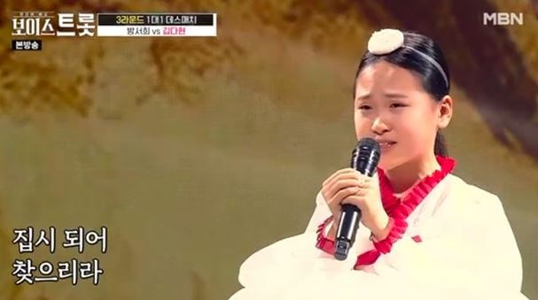 김다현은 무대 도중 눈물을 흘리면서 떨리는 목소리로 노래했습니다.