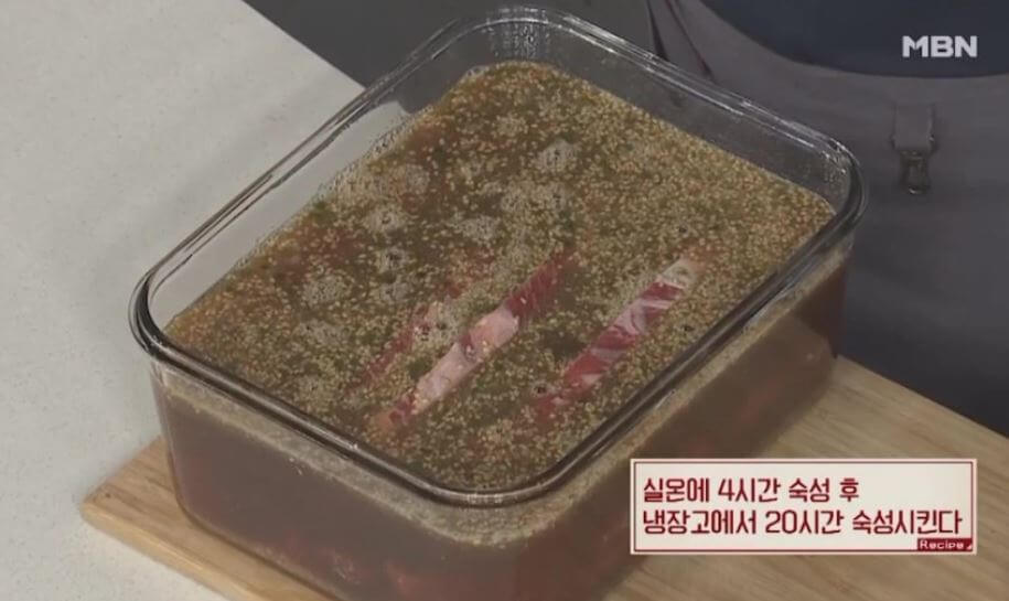 통에 LA갈비와 양념장을 켜켜이 쌓아 담은 후 실온에 4시간 숙성 후 냉장고에서 20시간 숙성시킵니다.