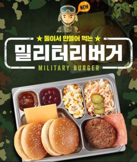 신제품 밀리터리버거는 버거 번 2개와 슬라이스 햄과 소고기 패티와 함께 양배추 믹스, 소스들을 군대식 식판 용기에 담아