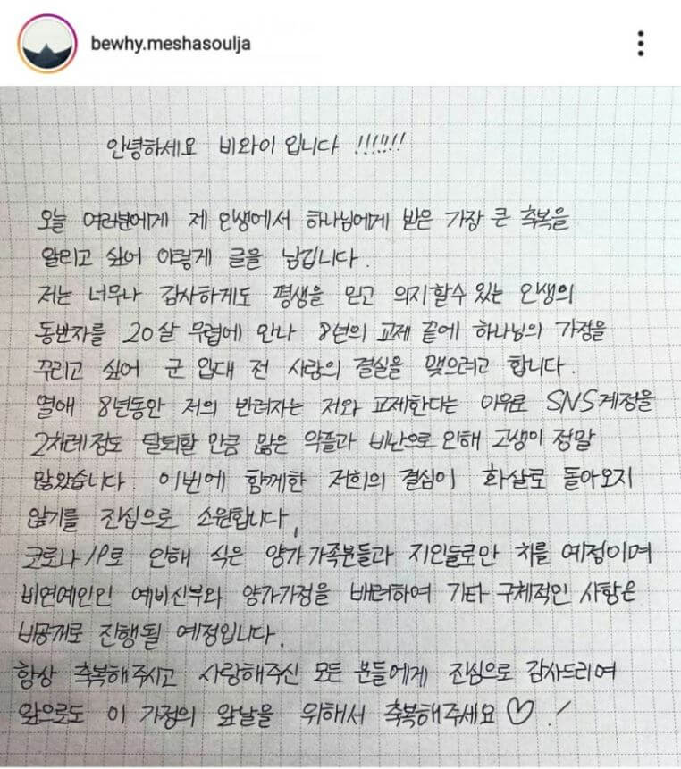 10월 22일 비와이는 8년째 교제해온 연인과 오는 10월31일 결혼식을 올리고 부부의 연을 맺는다고 발표 했습니다.