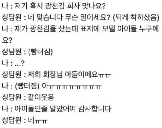 이를 본 누리꾼들은 전화해서 물어본 것도 웃기지만 광천김 모델 정체가 회장님 아들인 게 더 웃기다는 반응을 보였습니다.