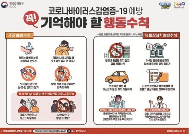 또한 코로나 증상이 의심되는 발열이나 기침, 가래, 근육통, 인후통 등 호흡기 계통에 이상 징후를 보이면 반드시 질병관리본부(☎ 1339) 또는 지역 내 보건소로 전화하시어 증상을
