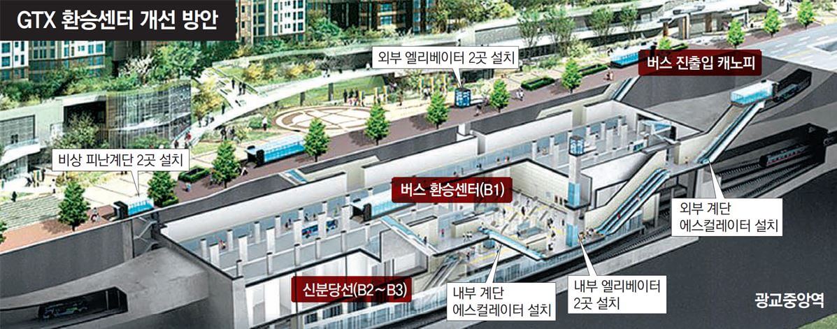 국토부 관계자는 “3개 조건은 예시로, 해당 역사의 여건에 맞게 GTX 역사 출입구, 대합실 등을 자유롭게 구상할 수 있다”며 “대표적으로 2016년 4월 문을 연 경기 수원시 신분당선 광교중앙역 환승센터는