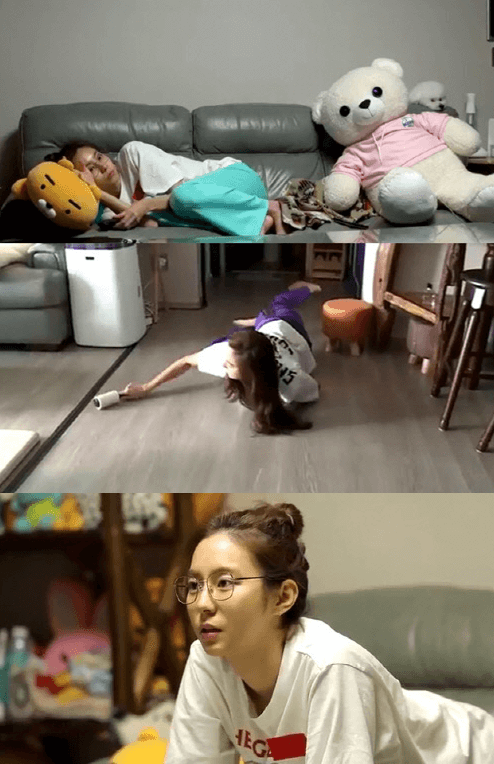 눈을 뜨자마자 유이는 소파는 물론 바닥과 한 몸이 된 눕방 라이프를 선보인다.