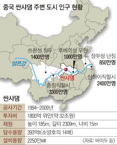 최대 저수량이 393억t으로 소양강댐의 14배이며 싼샤댐의 수위, 방류 여부는 창장 하류에 사는 4억명에게 영향을 미친다고 합니다.