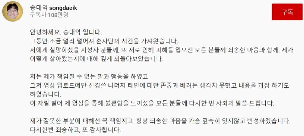 이처럼 황당한 사건의 주인공인 유튜버 송대익이 그간 누려온 인기의 맛을 잊지 못해서 인지 한달이라는 짧은 시간만에 유튜버에 얼굴을 내밀고 사과 반성을 했다고 합니다.