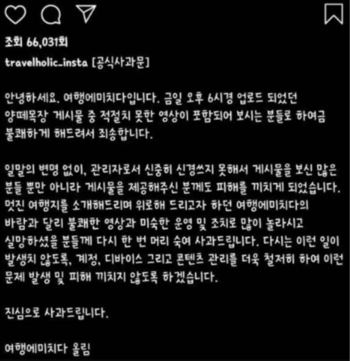 '여행에 미치다' 측은 지난 29일 오후 ‘양떼목장’ 관련 게시물을 업로드했는데 이중 성관계 영상을 올려놔 네티즌들을 충격에 빠뜨렸는데요.