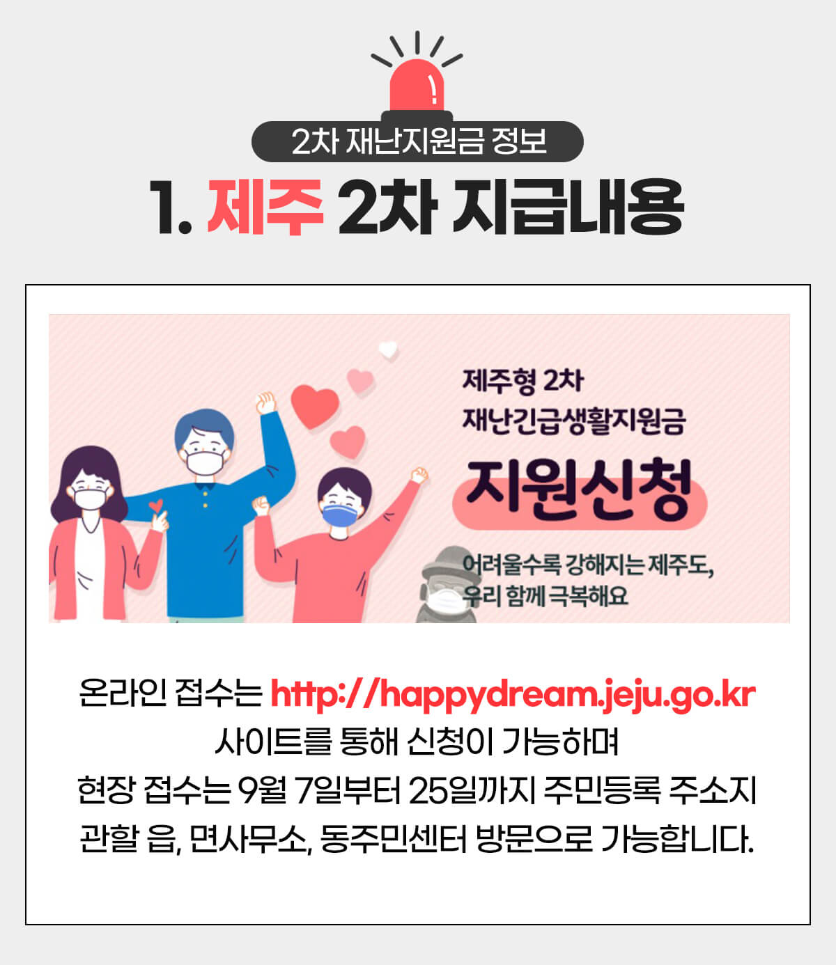 8월 24일부터 9월 27일까지 제주도에서는 2차 재난 긴급 생활 지원금을 신청할 수 있습니다.