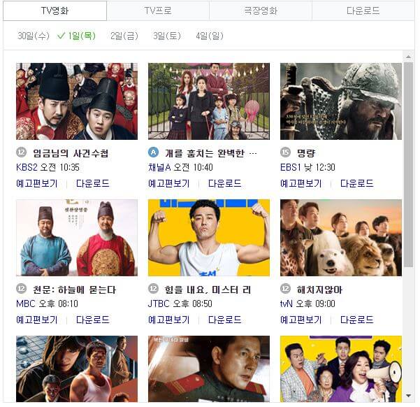 10월 1일 목요일 추석특선영화